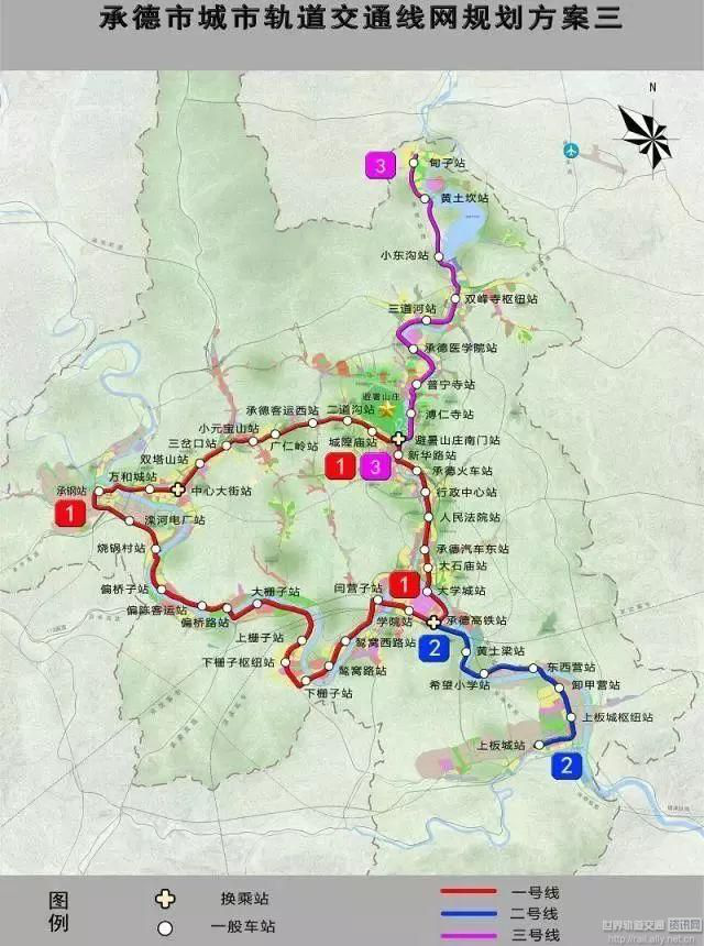 由3條線組成,線路間相互搭接,組合成環(huán)狀。1號線主要沿武烈河沿岸發(fā)展帶敷設(shè)。2號線主要銜接老城區(qū)與西區(qū)組團客流。3號線主要沿灤河沿岸發(fā)展帶敷設(shè)。