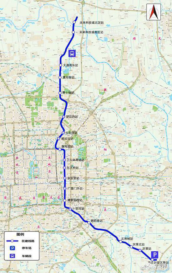 據(jù)北京市交通委員會官方微博@交通北京發(fā)布,17號線北起未來科學城北區(qū)站,南至亦莊站前區(qū)南站,全長49.7公里,設20座車站,全部為地下線,平均站間距2.57km。其定位為大運量等級快線,與在建的3號線、12號線、19號線等共同構成北京軌道交通大運量線網(wǎng)。