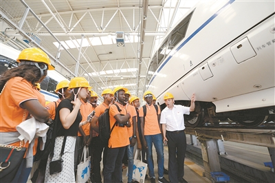 尼日利亞新入學(xué)留學(xué)生在西安動(dòng)車段高鐵仿真實(shí)訓(xùn)基地參觀。
