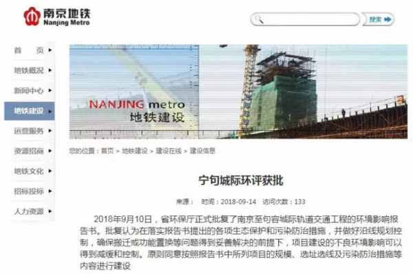 2018年9月14日,南京地鐵官方網站發(fā)布消息,寧句城際環(huán)評獲批。這意味著寧句城際距離開工更近一步!