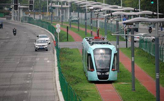 2018年9月10日,成都現(xiàn)代有軌電車蓉2號(hào)線首開段(合信路站至晨光站)正式啟動(dòng)動(dòng)車調(diào)試工作,調(diào)試期間將對(duì)車輛、信號(hào)等行車關(guān)鍵系統(tǒng)進(jìn)行全面驗(yàn)證。記者在現(xiàn)場(chǎng)看到藍(lán)色的有軌電車以20公里每小時(shí)的速度行駛,這個(gè)外形獨(dú)特的家伙吸引了路人不少的目光。有軌電車蓉2號(hào)線首開段線路起于合信路站,止于晨光站,全長(zhǎng)約13.7km,共設(shè)車站12座。線路由電子科大沿線經(jīng)時(shí)代天街、華為、富士康、菁蓉小鎮(zhèn)等到達(dá)郫都區(qū)。作為中運(yùn)量公交系統(tǒng)的典型代表,有軌電車主要采取地面行駛方式,運(yùn)行環(huán)境較為開放,乘客的視野及舒適性較好,同時(shí)具備軌道交通低碳、節(jié)能、環(huán)保等特點(diǎn)。