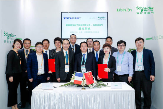 中國上海,2018年11月8日——近日,在首屆中國國際進(jìn)口博覽會(huì)現(xiàn)場,全球能效管理與自動(dòng)化領(lǐng)域數(shù)字化轉(zhuǎn)型的領(lǐng)導(dǎo)者施耐德電氣與特變電工股份有限公司(以下簡稱“特變電工”)正式簽署戰(zhàn)略合作協(xié)議,雙方將在原有合作基礎(chǔ)上,繼續(xù)拓展在新能源、輸配電、新材料及海外EPC等領(lǐng)域的全面深化合作。施耐德電氣中國區(qū)高級(jí)副總裁、全國銷售部負(fù)責(zé)人張煒與特變電工股份有限公司總裁助理賈飛代表雙方簽約。施耐德電氣全球執(zhí)行副總裁、中國區(qū)總裁尹正與特變電工股份有限公司董事長張新見證了此次簽約。