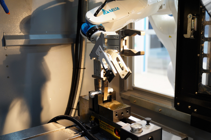 本次臺達展位的最大亮點為結合車床數控系統、立式高速加工中心機解決方案以及機器人工作站打造的“二機一手”動態(tài)展示機,現場模擬全自動化機臺銑削加工及機器人取放作業(yè):