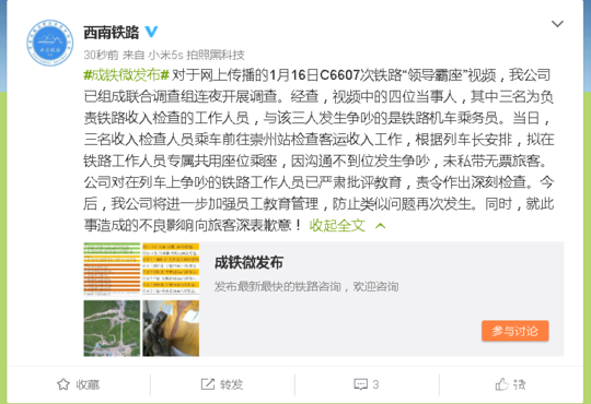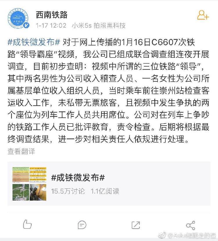 1月17日12:02,中國(guó)鐵路成都局集團(tuán)有限公司官微發(fā)布消息稱,對(duì)于網(wǎng)上傳播的1月16日C6607次鐵路"領(lǐng)導(dǎo)霸座"視頻,我公司已組成聯(lián)合調(diào)查組連夜開(kāi)展調(diào)查,目前初步查明:視頻中所謂的三位鐵路"領(lǐng)導(dǎo)",其中兩名男性為公司收入稽查人員、一名女性為公司所屬基層單位收入組織人員,當(dāng)時(shí)乘車前往崇州站檢查客運(yùn)收入工作,未私帶無(wú)票旅客,且視頻中發(fā)生爭(zhēng)執(zhí)的兩個(gè)座位為列車工作人員公用席位。公司在對(duì)列車上爭(zhēng)吵的鐵路人員已批評(píng)教育,責(zé)令檢查。后期將根據(jù)最終調(diào)查結(jié)果,進(jìn)一步對(duì)相關(guān)責(zé)任人依規(guī)進(jìn)行處理。