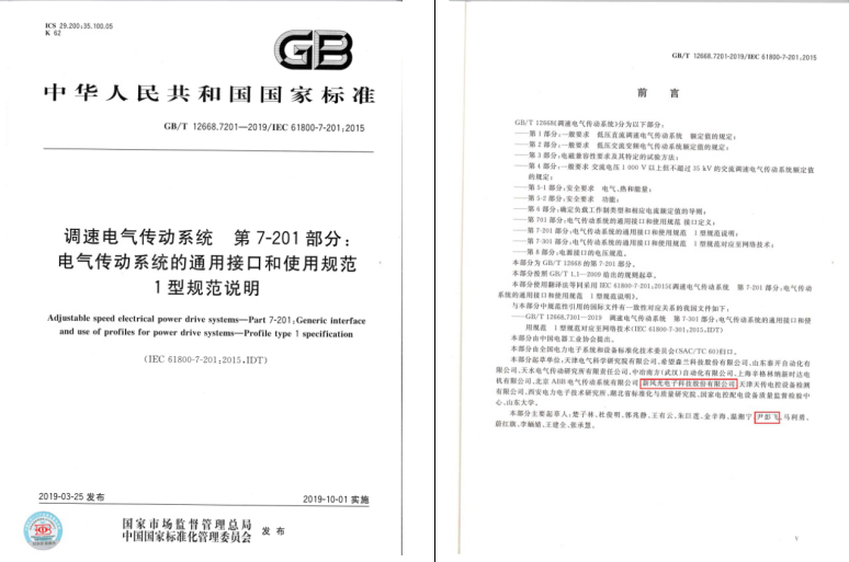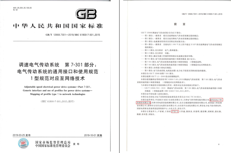 近日獲悉,新風(fēng)光電子科技股份有限公司(以下簡稱新風(fēng)光公司)參與編制的《GB/T12668.7201-2019調(diào)速電氣傳動系統(tǒng) 第7-201部分:電氣傳動系統(tǒng)的通用接口和使用規(guī)范1型規(guī)范說明》、《GB/T12668.7301-2019調(diào)速電氣傳動系統(tǒng) 第7-301部分:電氣傳動系統(tǒng)的通用接口和使用規(guī)范1型規(guī)范對應(yīng)至網(wǎng)絡(luò)技術(shù)》兩項國家標準,經(jīng)國家市場監(jiān)督管理總局、中國國家標準化管理委員會批準正式發(fā)布,并將于2019年10月1日正式實施。截止目前,新風(fēng)光公司先后主持并參與了15部國家及行業(yè)標準的起草審定工作。
