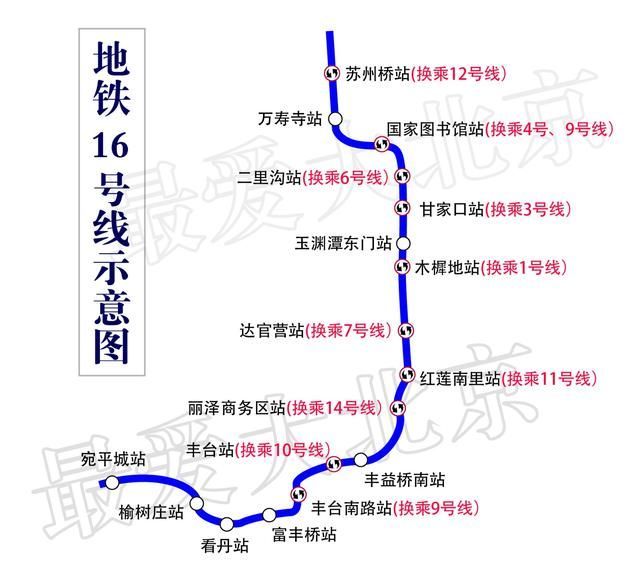 蘇州橋站、萬壽寺站、國家圖書館站、二里溝站、甘家口站、玉淵潭東門站、木樨地站、達官營站、紅蓮南里站、麗澤商務(wù)區(qū)站、豐益橋南站、豐臺站、豐臺南路站、富豐橋站、看丹站、榆樹莊站、宛平城站