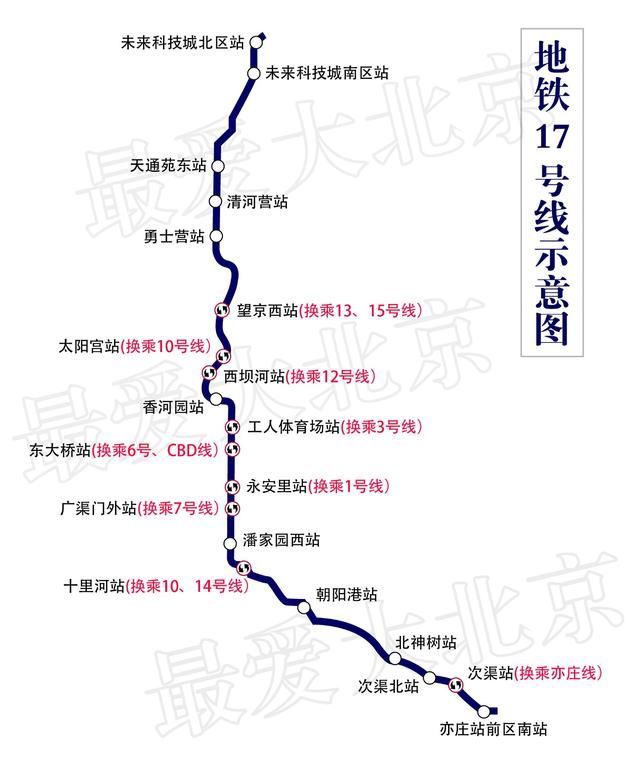 17號線縱貫昌平、朝陽、東城、通州4個區(qū),連接昌平未來科技城和亦莊新城,呈“L”形,其中段南北貫穿CBD。總長度約50公里的17號線共設(shè)20個車站,其中一半為換乘站。