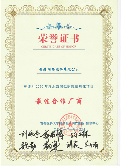 圖:銳捷網(wǎng)絡榮獲北京同仁醫(yī)院 “最佳合作廠商”稱號