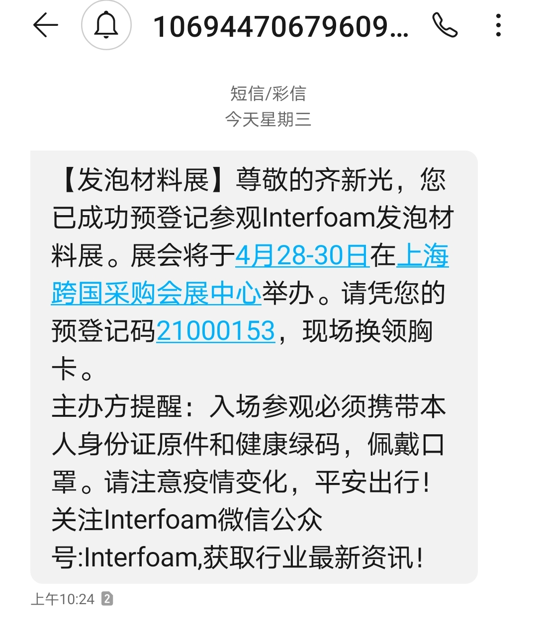 完成報名預登記后,就會收到我們的成功預登記確認函和短信,在現(xiàn)場通過自助預登記入口快速入場,免排隊等候,省時省事。
