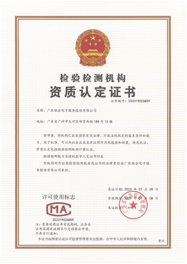 2023年1月,聯(lián)合電服公司通過廣東省市場(chǎng)監(jiān)督管理局行政許可,獲國家檢驗(yàn)檢測(cè)機(jī)構(gòu)資質(zhì)認(rèn)定證書,成為國內(nèi)首家獲得CMA認(rèn)證的省級(jí)收費(fèi)公路聯(lián)網(wǎng)結(jié)算管理中心。