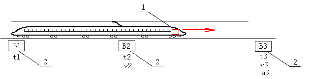 圖1中,標(biāo)號(hào)B1、B2、B3分別為列車(chē)前進(jìn)方向上安裝在二軌道中間的、按序分布的三個(gè)應(yīng)答器(2),列車(chē)前行時(shí)將依此經(jīng)過(guò)B1、B2、B3。列車(chē)查詢器(1)經(jīng)過(guò)應(yīng)答器的時(shí)間點(diǎn)分別為t1、t2、t3。同時(shí),由軌道設(shè)計(jì)安裝所決定的B1與B2間的距離為(B2-B1),同樣可得B2與B3間的距離為(B3-B2)。