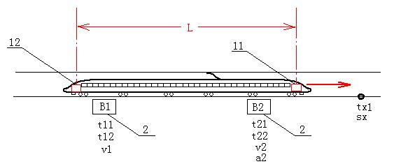 圖2為雙發(fā)查詢器運(yùn)動(dòng)學(xué)計(jì)程原理圖。圖中,(11)和(12)分別為車(chē)頭查詢器和車(chē)尾查詢器。