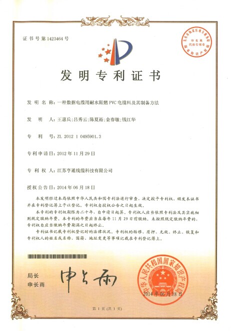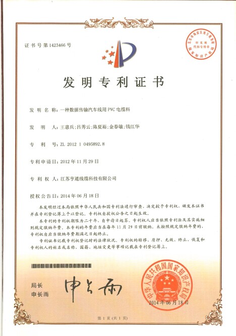 此證書是亨通線纜繼“一種數(shù)據(jù)傳輸汽車線用PVC電纜料”、“一種數(shù)據(jù)電纜用耐水阻燃PVC電纜料及其制備方法”及“阻燃耐火軌道交通信號軟電纜”三項發(fā)明專利之后的又一項重要發(fā)明專利,也是2014年度的第四項發(fā)明專利。