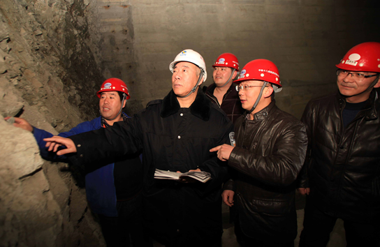 2、東北勘測(cè)設(shè)計(jì)院東北分公司總監(jiān)周克(左二)、十八局集團(tuán)隧道公司吉林引松項(xiàng)目經(jīng)理陳立和(右二)、常務(wù)副經(jīng)理魏代軍(右一)、副經(jīng)理田玉分(左一)在掌子面現(xiàn)場(chǎng)辦公(魏代奇 攝)