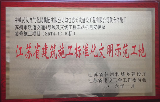 (記者 ??? 通訊員 雒亞琴 黃 靚)日前,中鐵武漢電氣化局上海分公司蘇州市軌道交通4號(hào)線及支線工程車(chē)站機(jī)電安裝及裝修施工項(xiàng)目(SRT4-12-10)標(biāo)榮獲“江蘇省建筑施工標(biāo)準(zhǔn)化文明示范工地”。