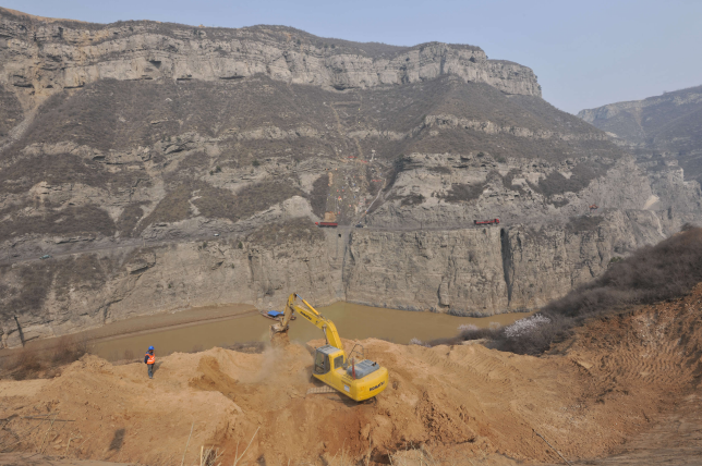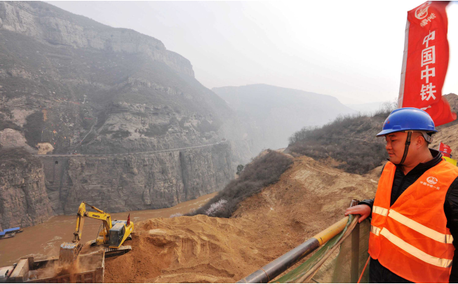 3月25日,中鐵一局陜西省韓城市龍門(mén)黃河大橋施工現(xiàn)場(chǎng)呈現(xiàn)一派施工大干的場(chǎng)面:奔騰的黃河從龍門(mén)奔涌向前,在黃河兩岸距河面100多米高的懸崖峭壁上,工人們正忙碌著用挖掘機(jī)修建施工平臺(tái)。