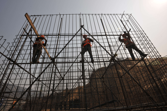 中鐵一局蒙華鐵路龍門(mén)大橋進(jìn)行鋼筋綁扎。牛榮健 攝
