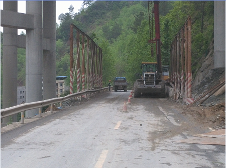 宏福村大橋下方跨國道區(qū)域路寬較為狹窄,平時剛好滿足兩輛車雙向行駛,而又由于施工條件受限,裝載機(jī)、吊車必須停靠在G318國道上,造成了該區(qū)域車輛只能單向通行。中交一公局華祥公司萬利高速公路五分部采取多種安全保障措施,確保了臨時防護(hù)棚拆除工作安全完成。拆除前,該分部派2名安全員前往拆除區(qū)域,每邊安排1人指揮交通,一邊放行則另一邊將車輛攔住,保證該區(qū)域車輛單向順利通行,待需要封鎖國道時,安全人員拉設(shè)警戒帶,設(shè)置警示標(biāo)牌,對國道進(jìn)行暫時封鎖。指揮人員指揮吊車、裝載機(jī)進(jìn)行拆除工作,并根據(jù)情況隨時與兩側(cè)安全員保持聯(lián)系,以便發(fā)生異常情況時可以及時防范,安全人員則確保在指揮人員發(fā)布放行指令前,嚴(yán)禁任何車輛和行人通行。待部分拆除工作完成后,指揮人員宣布放行,安全人員則解除封鎖,對國道車輛和行人放行,并幫助疏導(dǎo)交通。