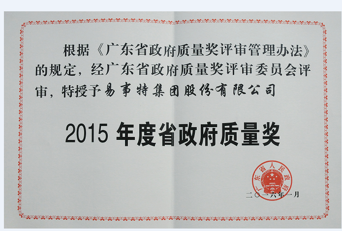 廣東省政府質(zhì)量獎(jiǎng)是廣東省人民政府設(shè)立的最高質(zhì)量獎(jiǎng)項(xiàng),每?jī)赡暝u(píng)選一屆,獎(jiǎng)項(xiàng)授予質(zhì)量管理成效顯著,產(chǎn)品、服務(wù)、工程、環(huán)保質(zhì)量以及自主創(chuàng)新能力和市場(chǎng)競(jìng)爭(zhēng)力等在國(guó)內(nèi)外處于領(lǐng)先地位,對(duì)全省經(jīng)濟(jì)社會(huì)發(fā)展作出卓越貢獻(xiàn)的企業(yè)或組織。2015年,易事特憑借過(guò)硬的品質(zhì)、卓越的質(zhì)量管理、質(zhì)量創(chuàng)新,經(jīng)過(guò)評(píng)委會(huì)層層篩選、嚴(yán)格評(píng)審,從眾多家申報(bào)企業(yè)中脫穎而出,成為獲此殊榮的9家企業(yè)之一。