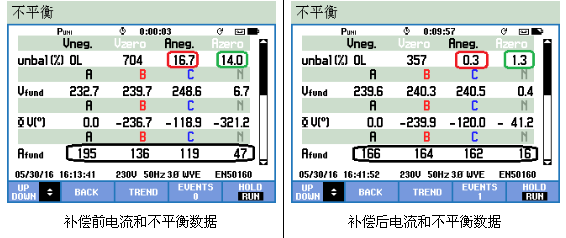 本投運項目,應用于一臺180kVA的變壓器,該臺區(qū)負荷的三相不平衡度較大,通過雙杰電氣的STUR對三相不平衡進行有效的治理,其負序不平衡度由16.7%下降至0.3%、零序不平衡度由14%下降至1.3%,零線電流由47A下降至16A、三相電流由195A、136A、119A調整至166A、164A、162A。其具體數(shù)據如下: