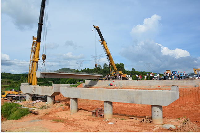 (記者 ???通訊員 楊小泉)6月26日14時18分,隨著重達65噸重的梁板穩(wěn)穩(wěn)地落在云湛高速公路BZK6+835中橋左幅第二跨橋墩墩位上,中鐵五局云湛高速公路13標項目部首片箱梁成功架設,成為云湛高速公路3個支線標成功架設首片箱梁的項目。