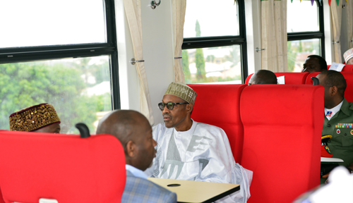 2016年7月26日,在尼日利亞首都阿布賈西郊伊都火車站,尼日利亞總統(tǒng)布哈里(中)試乘阿卡鐵路客車。2006年10月,中土公司與尼日利亞簽署尼日利亞鐵路現(xiàn)代化項(xiàng)目。該項(xiàng)目南起尼最大城市、經(jīng)濟(jì)中心拉各斯,途經(jīng)首都阿布賈,北至北部重鎮(zhèn)卡諾,線路全長(zhǎng)1315公里。阿卡鐵路于2011年開工建設(shè),并于2016年7月正式運(yùn)營(yíng)通車。新華社發(fā)(楊鴻杰 攝)
