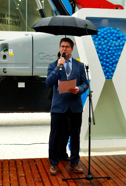 在此次的別具意義的慶典上,上演了一場(chǎng)別出心裁的開(kāi)幕儀式?;顒?dòng)現(xiàn)場(chǎng)的舞臺(tái)佇立著一面歷史墻,展示了雙方精彩的合作歷程。接著,雙方領(lǐng)導(dǎo)人開(kāi)啟了“時(shí)光積累塔”,隨著一只只藍(lán)色氣泡球的落下,“3000”的數(shù)字映入眼簾,代表著雙方未來(lái)共同發(fā)展新篇章的開(kāi)啟。為了紀(jì)念3000臺(tái)這個(gè)歷史性的突破,宏信向吉尼定制了一臺(tái)特別制作的紅色紀(jì)念版Genie ?S?-125直臂型高空作業(yè)平臺(tái),這臺(tái)別具意義的設(shè)備代表了兩家企業(yè)的發(fā)展歷程和對(duì)未來(lái)的美好展望。