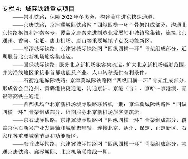在城際鐵路方面,將新建崇禮鐵路、京唐鐵路和廊涿、固保、石衡滄港、機場聯(lián)絡線一期、京石、廊香等城際鐵路,研究懷涿、津承、 唐遵、香平、石邯等城際,力爭投產(chǎn)400公里以上,促進京津冀協(xié)同發(fā)展,為北京新機場旅客集疏運及2022年冬奧會交通運輸提供必要保障。